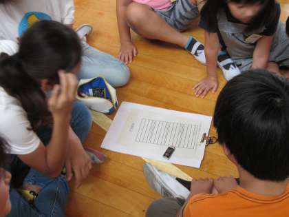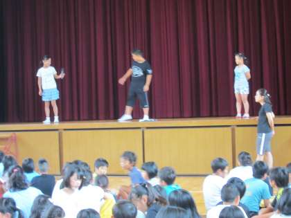 今日の児童集会は、「聖徳太子」ゲーム。一度に多くの人の話を聞き分けたといわれる聖徳太子にちなんだゲームです。舞台で3人の児童が一斉に同じ字数の言葉を言って、その言葉を各班で当てるという内容です。全問正解の班は、24班のうち3班ありました。