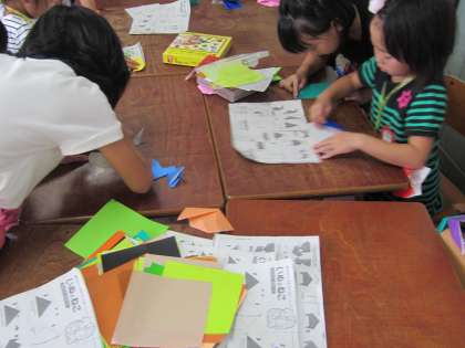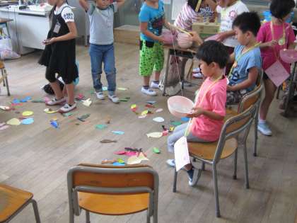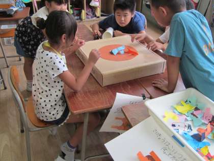 2年生が生活科の学習で、「なつまつり」を行いました。学年でお店を行うグループに分かれて準備をしてきました。さかなつり、わなげ、とんとんずもう、スーパーボールすくいなど楽しいお店が並びました。4時限目に1年生が招待されて、2年生と楽しく交流することができました。