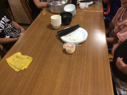 昨日と同じように食べ終わったらグループごとに食器などを重ねて片付けの用意をします。