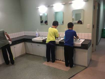 部屋の片づけと美化係の人が洗面所の掃除をしています。