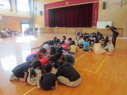 今日の児童集会で、明日のたてわり遠足の話し合いをしました。班のめあてを決めたり、みんなで遊ぶゲームを決めました。その後、各班で実際にゲームをして遊びました。