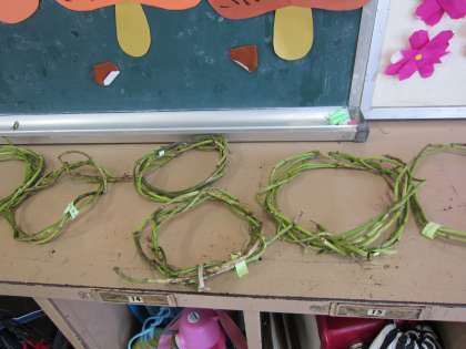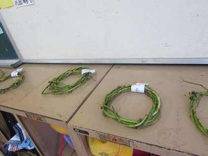 2年生の児童が生活科の学習でさつまいもを育て、先日、いもほりを行いました。その時にとっておいたさつまいものつるを使って、クリスマスに飾るリースを作りました。みんなとても上手に作っています。