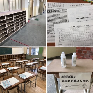 来校時にはマスク着用の上、玄関にて消毒液による手指消毒を!教室前では廊下に赤い線が目印のソーシャルディスタンスを!教室内では、担任との出会いと教科書その他の配布物のお願いを!
