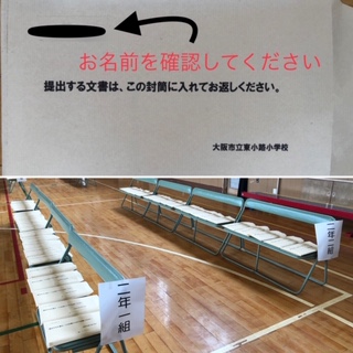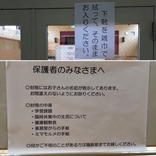 明日と明後日の2日間は「配付日」となります。9時から16時30分までの間に、いつでも結構ですので、体育館に直接お越しください。なお、入口に雑巾がありますので、靴裏を拭いていただき、そのままお入りください。学年別に持ち帰り封筒を置いていますので、各自でお持ち帰りください。感染症拡大予防のため、ソーシャルディスタンスを守っていただき、「密接」「密集」とならないようにご理解とご協力をお願いします。どうしても両日ともご都合の悪い方は学校(6751−4465)までご相談ください。