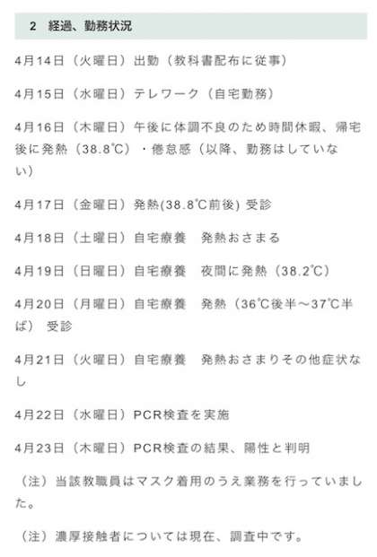 本日、淀川区の新北野中学校の教職員1名に陽性の診断が出ました。学校は生徒の預かり中止、校内の消毒、教職員の自宅待機など対応に入りました。教育委員会ホームページには、上記の内容が掲載されています。マスクは着用されていたようですし、学校としても教科書配付には対策をされていたことでしょう。それでも感染は容赦なく広がっています。学校は決して例外ではありません。