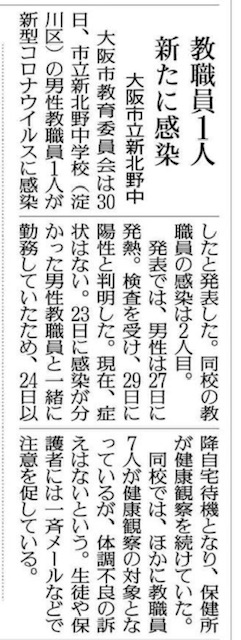 さて、学校現場で初の感染が認められた新北野中学校で、さらなる陽性の教職員が見つかりました。残念なことです。これ以上の感染拡大とならないことを祈るばかりです。