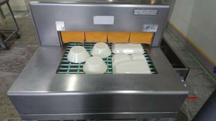 食器たちはベルトコンベアーに乗って上下の、パイプからのシャワーによって、綺麗になって出てきます。