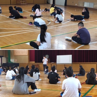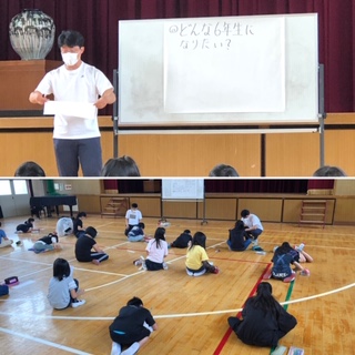 体育館で3密を避けて、全員が集合しました。ここでは、「どんな6年生になりたい?」をテーマに話し合い、自分の考えを持ちました。