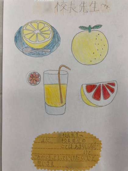 一人の子どもが玄関に立つ私の所まで来て、一枚のメッセージカードを渡してくれました。そこには、私の大好きな「グレープフルーツ」がとても上手に描かれていました。