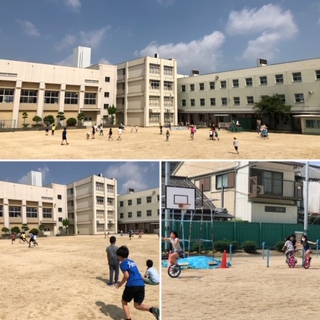 今は午前中に2回の休み時間があります。1回あたりは15分と長めの設定です。これは「手洗い」を入念にする感染症対策のためです。子どもたちは終わり5分前の放送を聞くとすぐに遊びをやめて水道へ向かいます。また、2回の休み時間も前半は1・3・5年、後半は2・4・6年と分散して遊んでいます。これも感染症対策です。