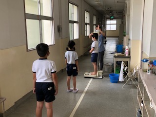 子どもたちはとても静かに廊下に出て、人との距離を守って測定しています。どの子どももおしゃべりせずに、約束を守って測定できました!