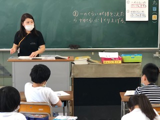 子どもたちにとってもわかりやすいのが一番!教員は子どもの意見を拾い上げ、それをつなげることが役割です。ノートの使い方もていねいに指導しています。集中する子どもたちです。
