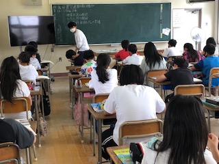 震災直後の様子について、学ぶ子どもたち。時間が経てば経つほどに、記憶から遠ざかる震災の姿です。しかし、決して忘れてはならないことであり、もしもの備えを大事にしなければなりません。子どもたちも真剣な眼差しで授業に臨んでいました。