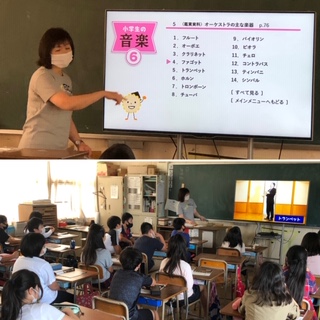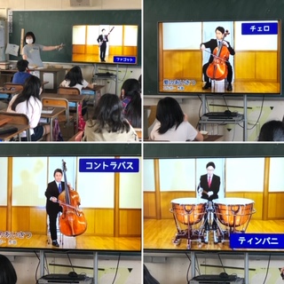 音楽の授業が始まりました。コロナ対応で歌を歌うことや演奏することに制限がある中、今日はオーケストラの楽器について学習しました。
