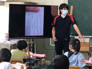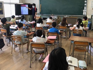 ICTを使って、丁寧なふり返りをします。子どもたちも画面を見ながら、自分の答えを確かめ、考えを深めます。