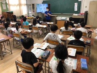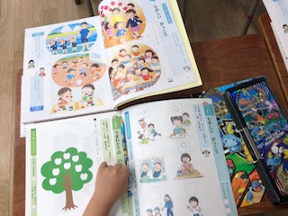 子どもたちは泳ぐ絵や遠足の絵を見て、やってない!できてない!と残念がる様子!それでも、みんな笑顔で学校生活を振り返りながら、教科書を見つめていました!
