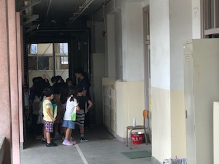 廊下を覗くと、教室前で静かに並ぶ子どもたちを発見!