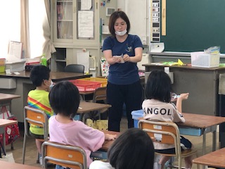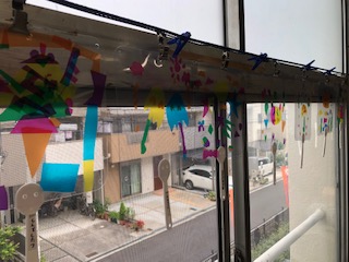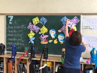 背面黒板や窓枠に図工の作品が飾られています。ステンドグラス風の団扇や水中の様子を表現したものなど楽しさいっぱいです。