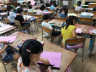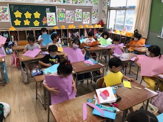 「 おしゃれなTシャツ」づくりの学びです!自分の好きな色画用紙をTシャツの形に切り、クレパスで色つけをしていきます。