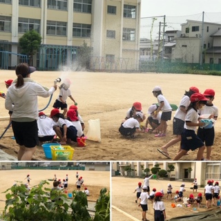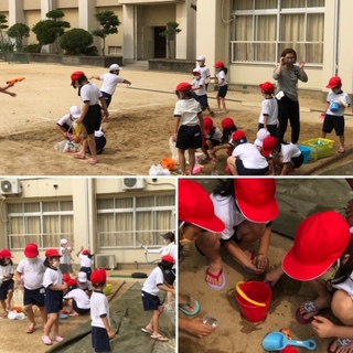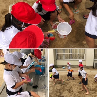 家庭から持ち寄った道具を使いながら、土を掘ったり、土に水を流したり、水鉄砲でかけあったり、短い時間でしたが、暑い夏を楽しみました!