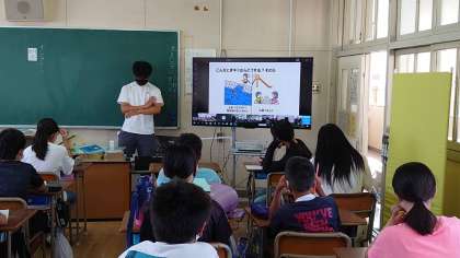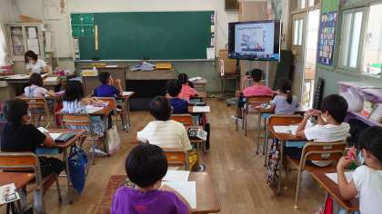オンライン朝会では、防災サバイバルと題して、紙芝居形式による「もし、君ならどうする?」を子どもたちと学びました。