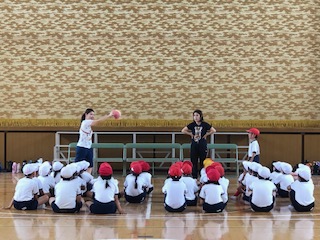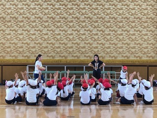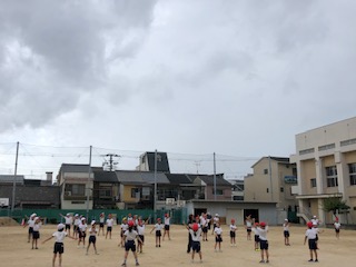 台風の影響で風が強い中、子どもたちは元気に運動場で体操をしています。と、言ってるのも束の間、大粒の雨が降り出し、体育館へ急遽移動です!