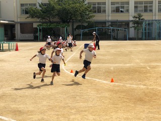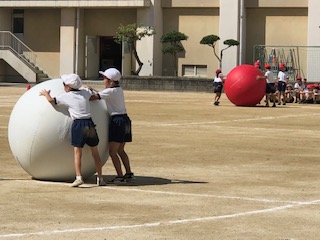 秋晴れの爽やかな気候の中、子どもたちは大玉転がしで汗を流しています!二人の気持ちを合わせることがたいせつなこの競技!仲良く楽しく走る姿が可愛かったです!また個人走にもチャレンジします!コーナーを曲がるときの一生懸命な顔が印象的でした!