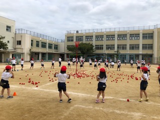 子どもたちは「大きな声を出さない」「となりの人と離れて」など約束を守りながら、玉入れに夢中になっていました。
