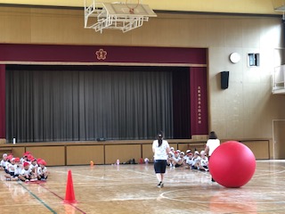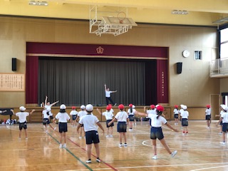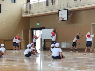 体育館いっぱいに広がって、子どもたちが体をリズムに合わせて動かしています!