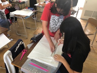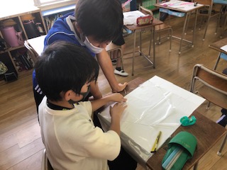 子どもたちは図画工作科の学びで、林間学習の時に使う、「手作り凧づくり」にチャレンジしています!