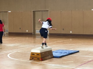 跳び箱を使った基礎基本の運動です!跳び箱に上がったり、またがったり、高く飛んだり、上手に着地したり、子どもたちは一人一人が楽しそうに躍動していました!