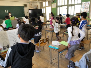 音読の学びです。先生からのおすすめの詩をみんなで声にします!アトランダムに選ばれた代表の子どもたちが先導します!「たけのこ読み(自分の気に入った場所を自分から立ち上がって読むこと)」で読み進めます!子どもたちは元気な声で、しっかりと音読ができました!拍手です!