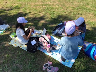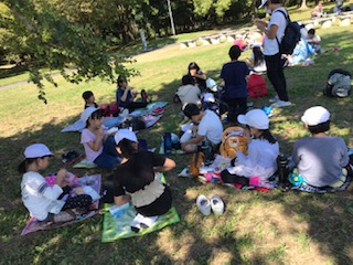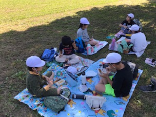 太陽の下、子どもたちは楽しくお弁当を囲んでいます!