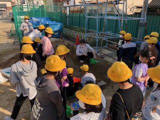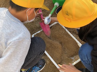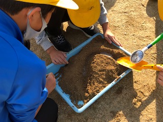 実際にトレーに土を入れ、模型を作ります。高さや傾斜をつけながら、水の流れを体感します。