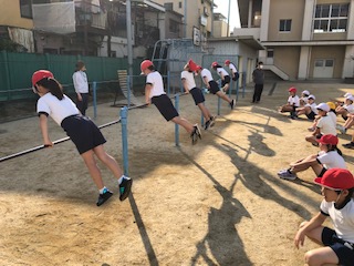 夕方の日差しが入る運動場では、子どもたちが鉄棒にチャレンジしていました!
