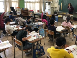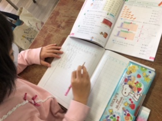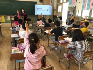 「4つ入りのみかんの袋がいくつ分?」で考えます!いくつ分を考えるときの例文には、実際のクラスの子どもたちを登場させて、リアル体験をさせながら学びます!友だちが登場するので、ワクワク楽しく九九を学ぶ子どもたちでした!