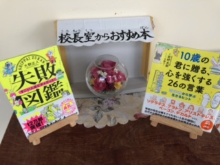 「失敗図鑑」ともう一冊!「10歳の君に贈る心を強くする26の言葉」の二冊を校長室前の廊下に展示しています。