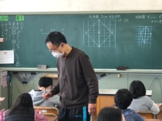 「対角線が5センチメートルの正方形を書きましょう!」の問題に苦戦する子どもたち。