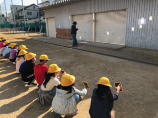 体育倉庫前では何やら光のシャワーがチラチラ!子どもたちが鏡を使って、光の学習をしています!