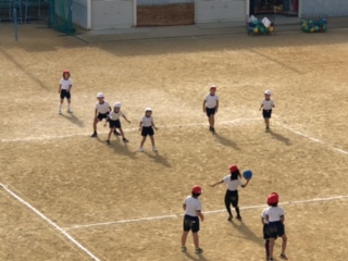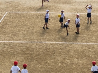 朝晩の冷え込みと比べ、昼間は日差しもあり少し暖かみを感じる運動場では、子どもたちがドッジボールの学習をしています。