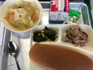 今日のメニューは「豚肉のガーリック焼き」「スープ」「ほうれんそうのソテー」「ソフトマーガリン」です!