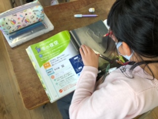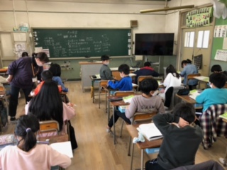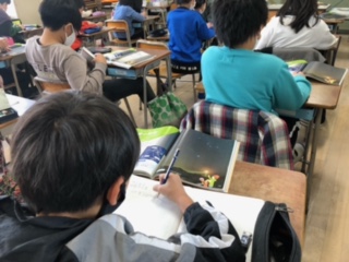 教科書の写真から星たちを見つけます!こんなにも星が見えることは大阪ではないですが、子どもたちは映像も交えながら、冬の星空の世界に浸っています!