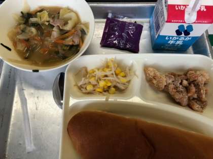 今日のメニューは「鶏肉のからあげ」「中華みそスープ」「もやしとコーンの甘酢あえ」「ブルーベリージャム」