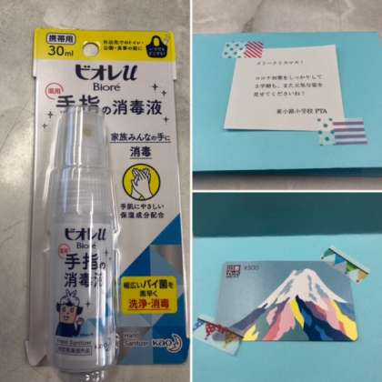 中身は、コロナから自分を守るための「消毒スプレー!」& コロナ禍で自分の時間を過ごすための「図書カード(500円)]です。