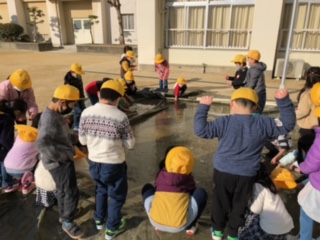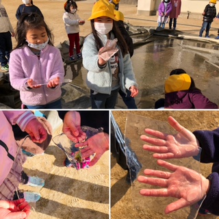 職員室にいると運動場から子どもたちの元気な声が届きてきました。見ると校庭のあちこちで氷がはっているらしく、子どもたちは大喜びで氷と戯れていました。