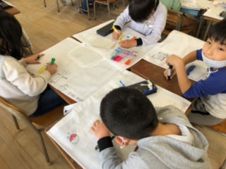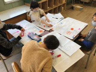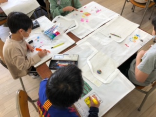 子どもたちは思い思いの絵を作品袋の白いキャンパスに敷き詰めていきます。
