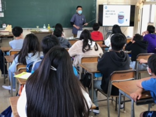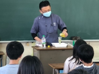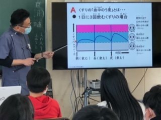 先生が本物のジュースを使って実験を見せてくれました。薬と一緒に飲むための水分についての問題?水?お茶?ジュース?など実演しながら学びました!なぜジュースがダメなのかを知ることができました!また、くすりの飲むタイミングや効き方について学びました!なぜ朝昼晩なのか?それは薬の血中濃度が影響しています!さらに、副作用についても教えてもらいました!