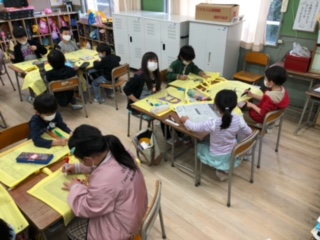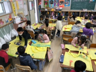 黄色い大きなキャンパスに、思い思いの絵を描いている子どもたち!