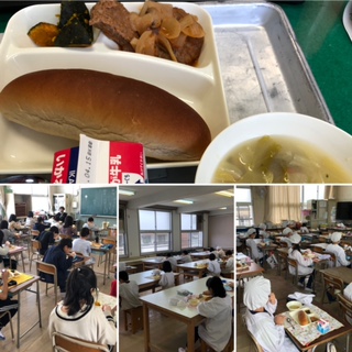学校では給食時間です。各教室では「だまって配膳、だまって喫食」とがまんの連続ですが、みんなその約束を守ってがんばっています。シーンと静まり返る校内の時間ですが、それだけみんなが自分の命、隣の人の命を大切にしている証です。