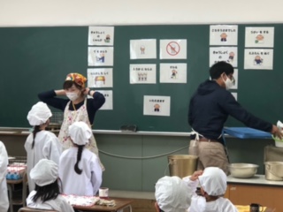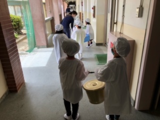 重い食缶を友だちと上手に運ぶ子どもたち!まだ慣れない給食ですが、先生たちのお話をしっかりと聴いて、当番の仕事をがんばっています!